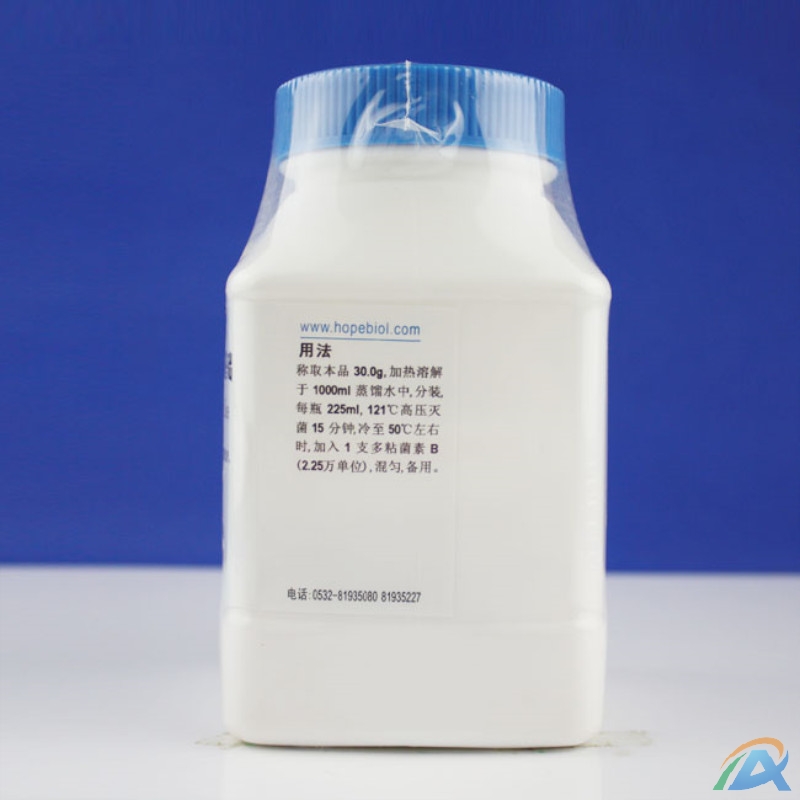 称取本品 30.0g,加热溶解于 1000ml 蒸馏水中,分装,每瓶 225ml,121℃高压灭菌 15 分钟,冷至 50℃左右时,加入 1 支多粘菌素 B (2.25万单位),混匀,备用。