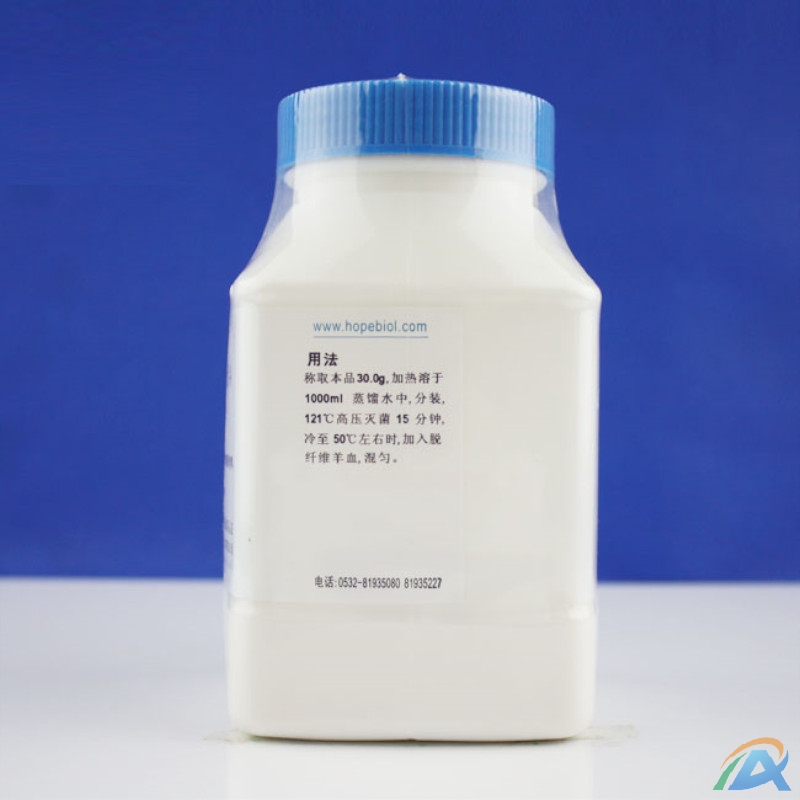 用法:称取本品 30.0g,加热溶于1000ml 蒸馏水中,分装,121℃高压灭菌 15 分钟,冷至 50℃左右时,加入脱纤维羊血,混匀。